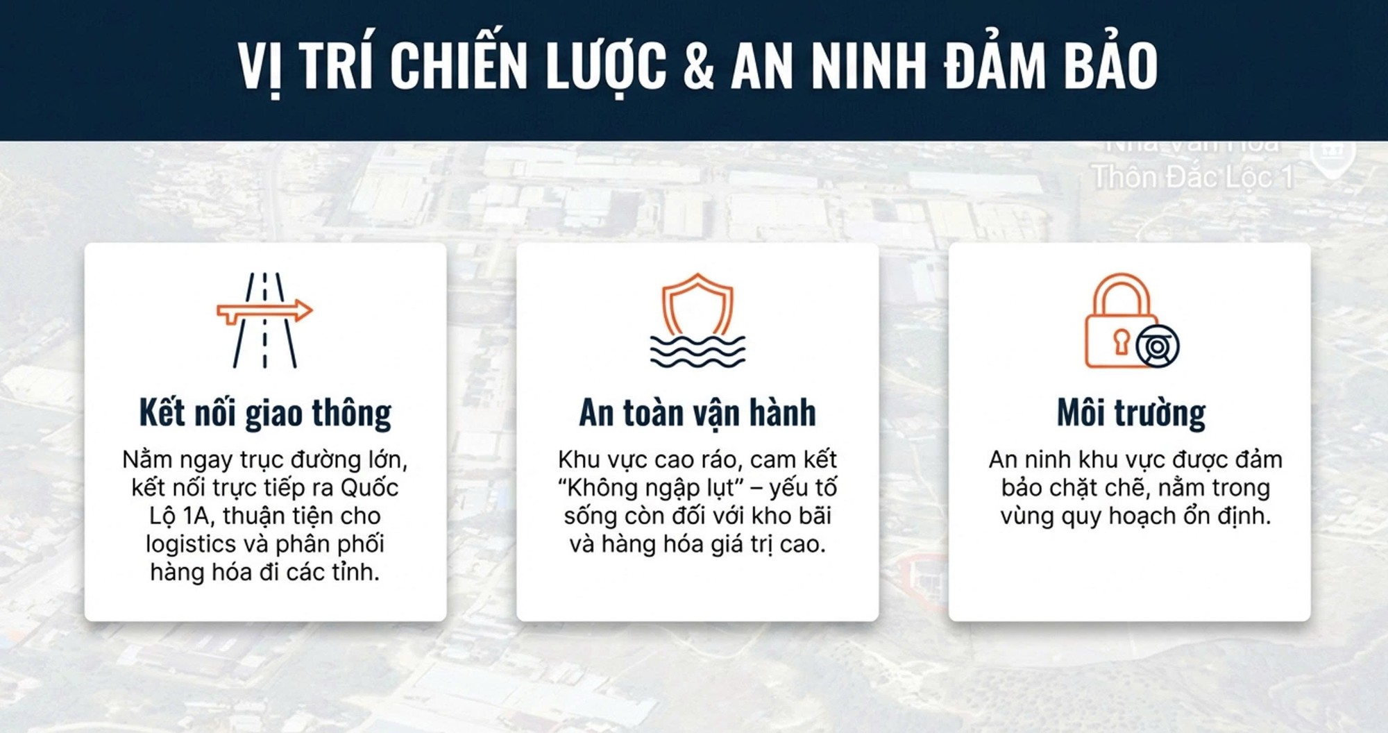 Địa hình an toàn: Khu vực cao ráo, cam kết tuyệt đối không ngập lụt, bảo vệ an toàn cho máy móc và hàng hóa của doanh nghiệp.